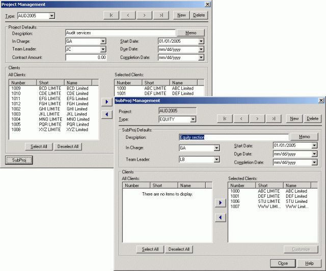 Set up the projects and subprojects of your firm and then assign them to clients.
